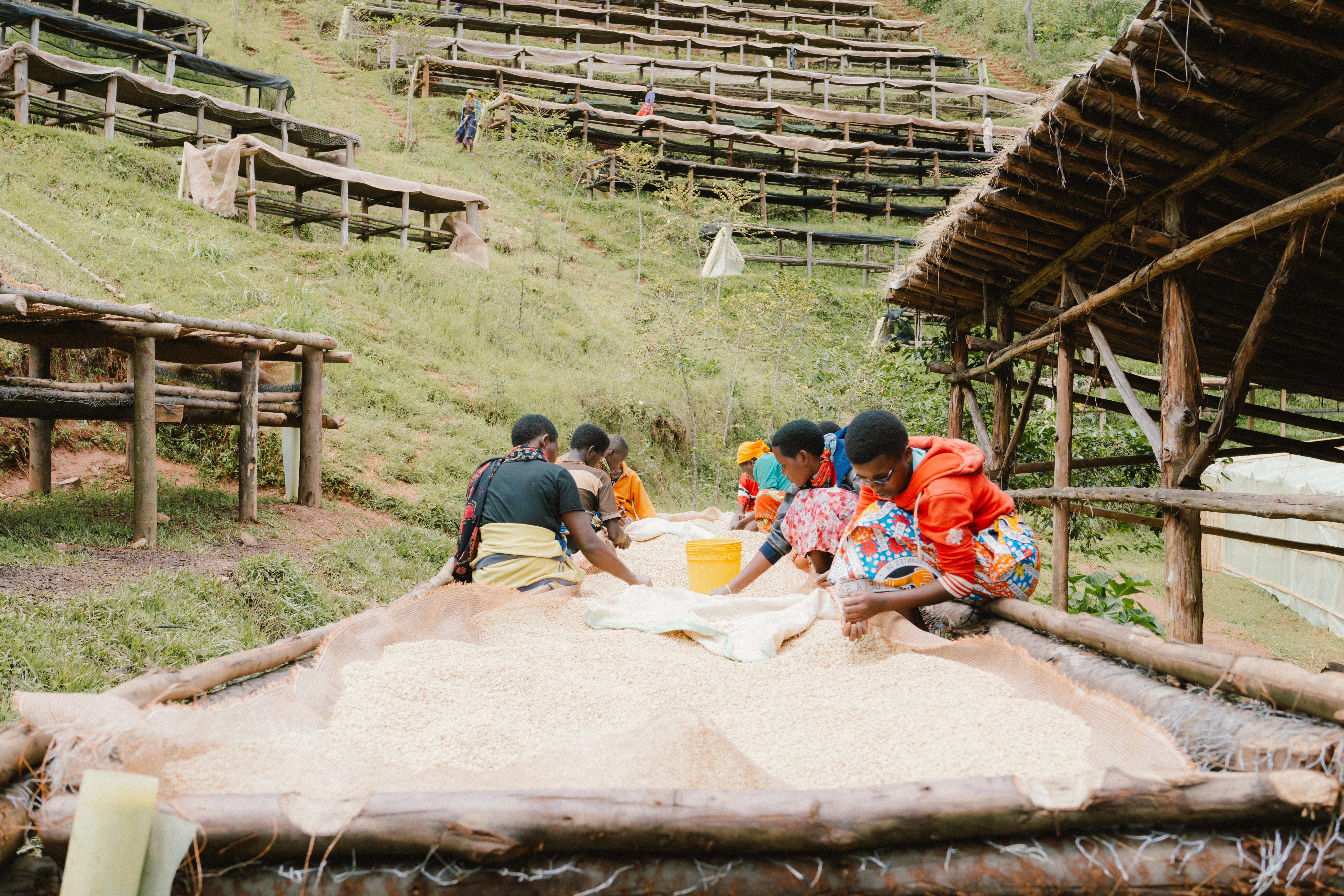 Heza Washing Station processes its coffee by pumping spring water from a nearby natural spring. During the fully washed and honey process freshly harvested cherries are delivered by coffee farmers to the long Miles Coffee Washing Station, then floated and hand-sorted for ripeness upon arrival. The cherries are pulped and undergo a double fermentation process. Parchment spends around twelve hours dry fermenting, then undergoes a twenty-four hour wet fermentation. The parchment is sometimes ‘footed’ after fermentation. The team will agitate and dance on the slippery coffee parchment by foot, helping to loosen any remaining mucilage clinging to it. It is then rinsed in fresh water for washed, graded by density and left to soak for another four to six hours in the final rinse tank. For their honey process the parchment is carried to covered drying tables where it spends between six to forty-eight hours pre-drying. During this time, it is hand-picked for under-ripeness, over-ripeness, insect damage and visual defects. It is then moved to traditional African raised tables where it spends between sixteen to twenty days slow drying. During the natural process coffee cherries are floated and hand-sorted, then taken straight to the drying table. The whole coffee cherry spends roughly 25-30 days drying in its own skin turning from deep red to a prune like purple-black once fully dry.